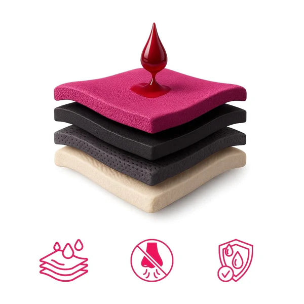 Proteção real dentro de água. Tecnologia absorvente de tripla camada para fluxos ligeiros a moderados. Designs para todos os estilos. Materiais seguros e sustentáveis, com tecidos certificados, hipoalergénicos e livres de substâncias tóxicas. Fáceis de lavar e reutilizar.